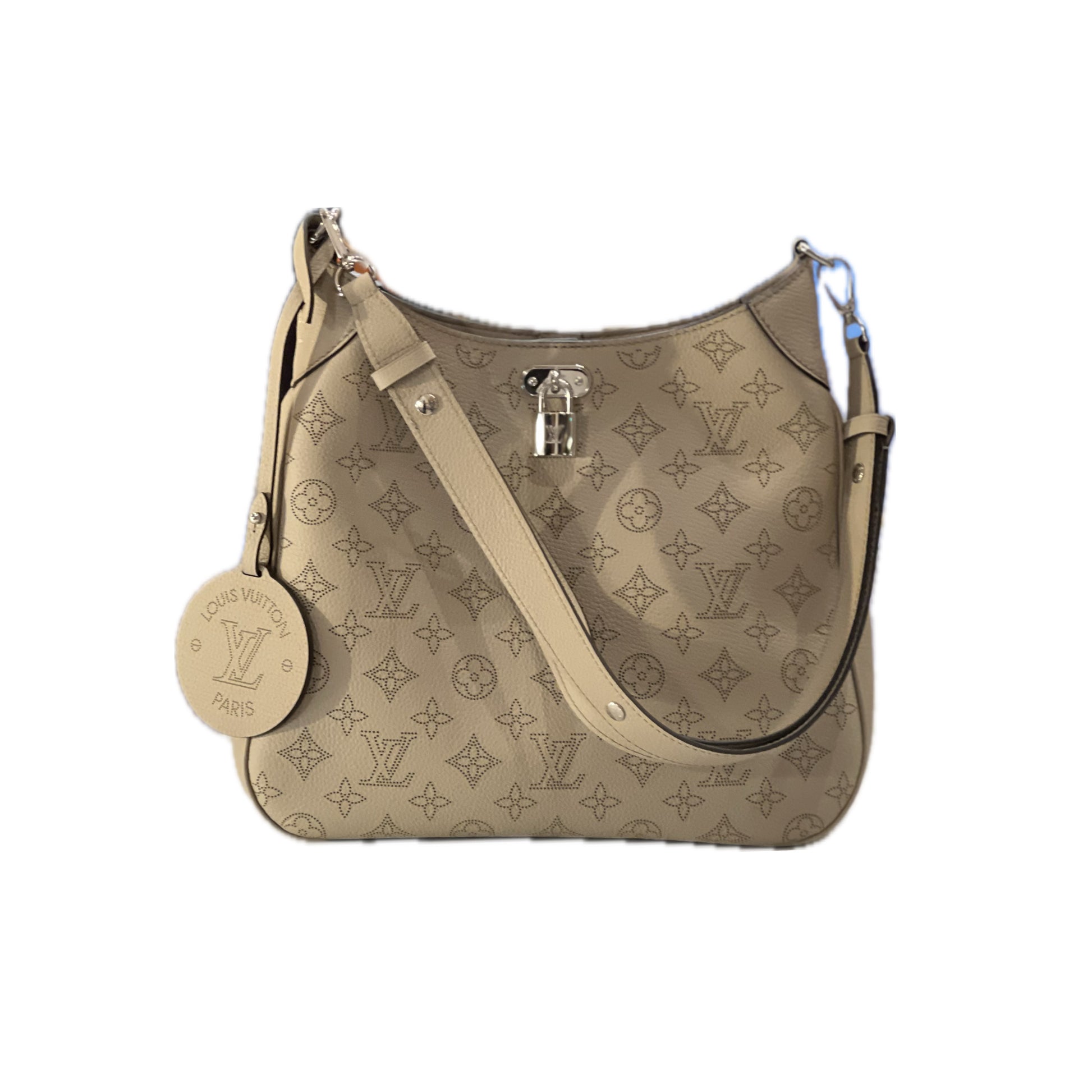 Borsa in pelle di vitello con motivo Monogram traforato. Hardware argentato con chiusura magnetica e tracolla regolabile. In dotazione charm con iniziali LV e lucchetto decorativo.
